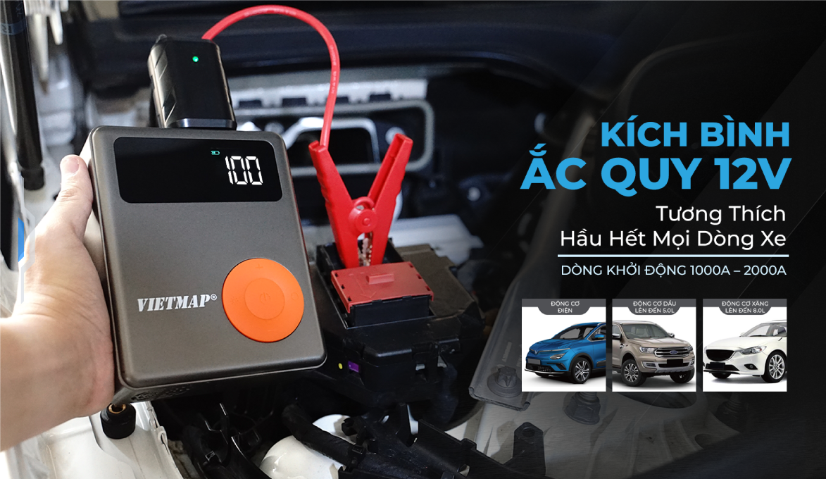 Sở hữu dung lượng Pin lên đến 12000mAh cùng dòng khởi động 1000A - 2000A tương thích 99% các dòng xe cá nhân Sedan; SUV hiện tại trên thị trường bao gồm xe điện, xe động cơ dầu diesel lên đến 5.0L, xe động cơ xăng lên đến 8.0L. Bơm Lốp Kích Bình VIETMAP 4 trong 1 là giải pháp tốt nhất cho mọi trường hợp xe bị cạn bình, chết máy, cần kích nổ mà không cần câu điện từ xe khác hay chờ cứu hộ. Thao tác dễ dàng, kích bình ắc quy nhanh chóng.