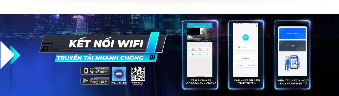 SpeedMap M1 còn trang bị công nghệ chuẩn hình ảnh H.265 kết hợp truyền dữ liệu không dây giúp việc xem lại, trích xuất video nhanh chóng trên các thiết bị hệ điều hành Android, IOS thông qua ứng dụng VIETMAP REC.