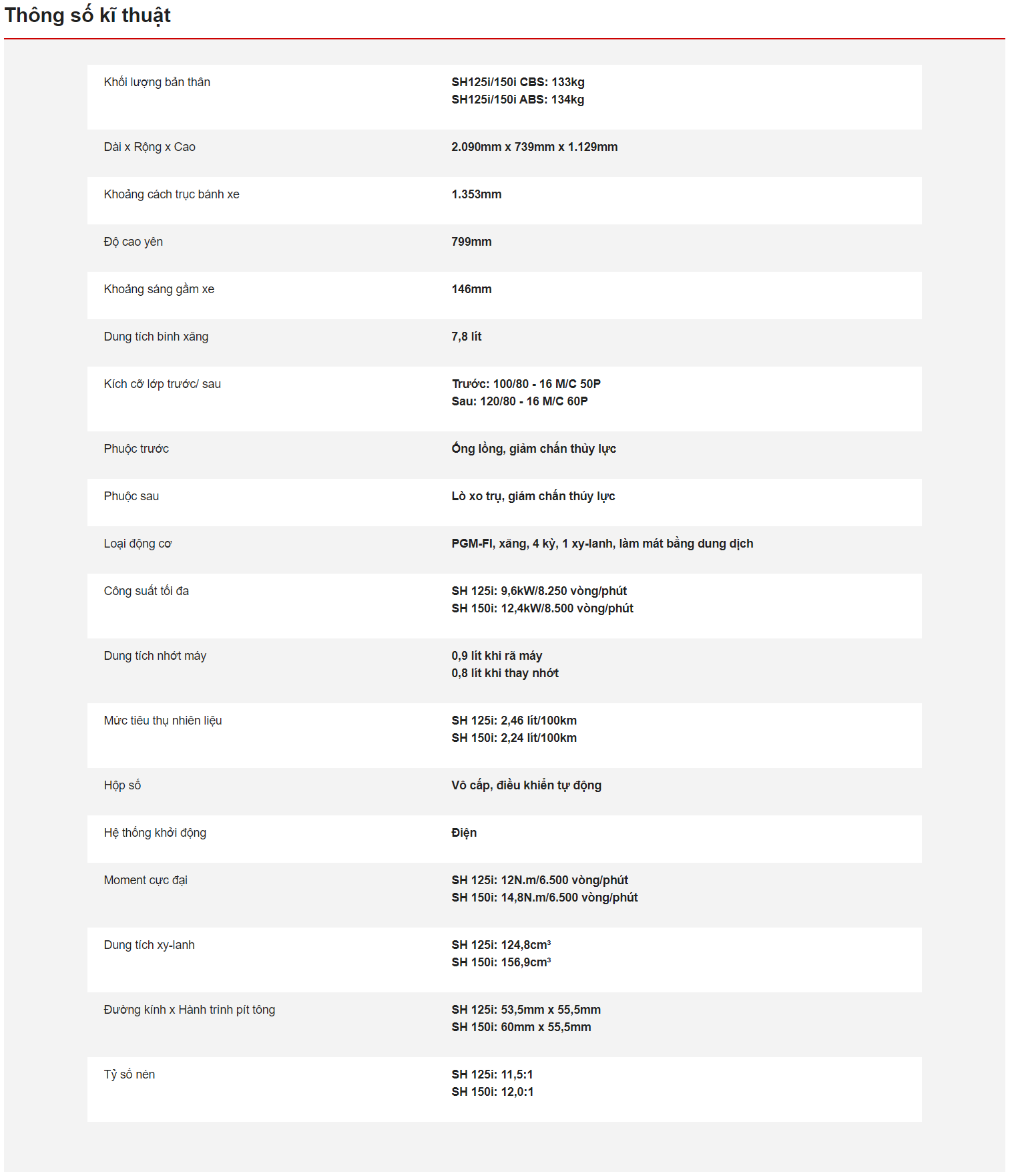 (*) Chức năng được trang bị trên phiên bản SH150i