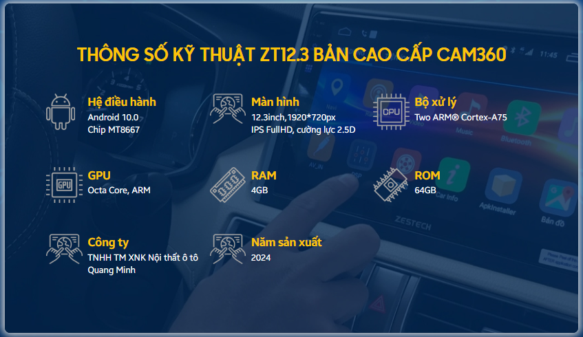 Siêu phẩm Màn hình Android ô tô thông minh ZT12.3 BẢN CAO CẤP CAM360 - Giải Pháp Màn Hình Ô Tô Đẳng Cấp Quốc Tế mang đến trải nghiệm lái xe an toàn và hoàn hảo. Kết hợp với các công nghệ tiên phong,ZT12.3 BẢN CAO CẤP CAM360 chắc chắn là sự lựa chọn hợp lý về chi phí khi đầu tư màn hình android cho ô tô của bạn.