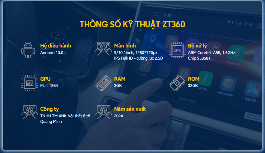 Siêu phẩm Màn hình Android ô tô thông minh ZT360 - Giải Pháp Màn Hình Ô Tô Đẳng Cấp Quốc Tế mang đến trải nghiệm lái xe an toàn và hoàn hảo. Kết hợp với các công nghệ tiên phong, ZT360 Bchắc chắn là sự lựa chọn hợp lý về chi phí khi đầu tư màn hình android cho ô tô của bạn.